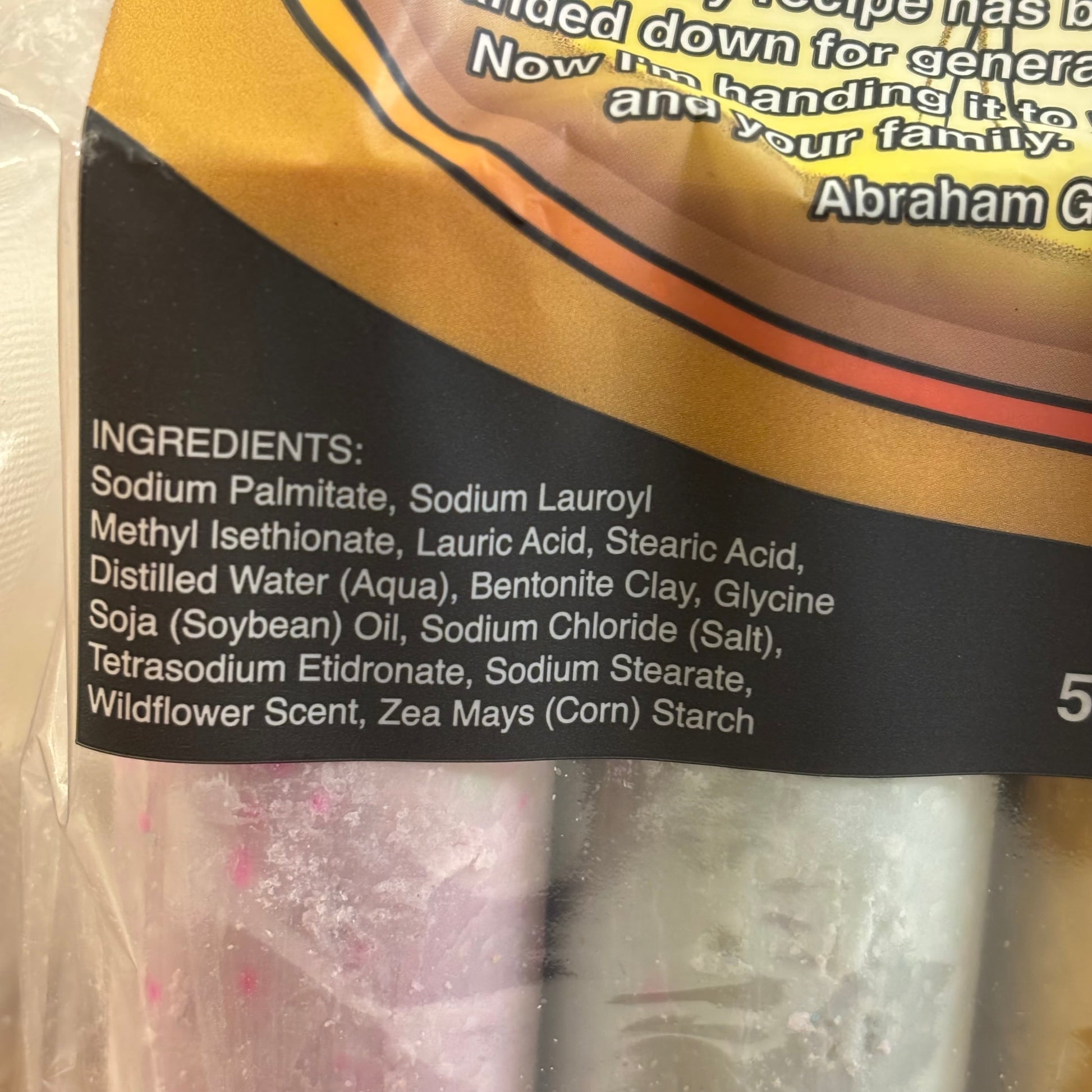 • Made in United States • Ingredients: Sodium Palmate, Sodium Laurel Methyl Isethionate,, Lauric Acid, Stearic Acid, Distilled Water (Aqua), Bentonite Clay, Glycine Soda (Soybean Oil), Sodium Chloride (Salt), Tetrasodium Etidronate, Sodium Stearate, Fragrance, Zea Mays (Corn) Starch • Weight: 2.15 lb (0.98 kg)
